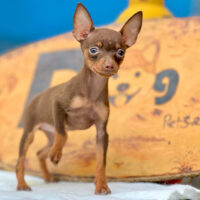 🐾 Adele là một bé Phốc Hươu (Miniature Pinscher) siêu nhỏ, 2 tháng tuổi, màu nâu socola hiếm, thuần chủng, dáng gọn xinh như một “phiên bản bỏ túi” của giống chó quý tộc này 🍼🤏. Lớp lông mượt óng ánh dưới nắng, đôi mắt to tròn biết cười và đôi tai dựng cao khiến Adele trông vừa lanh lợi vừa duyên dáng.