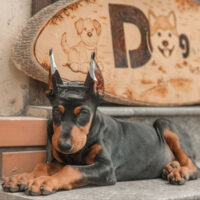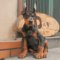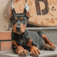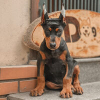 🐾 Armin là một bé Doberman đực với bộ lông đen huyền óng ả xen các mảng vàng rám nắng cực chuẩn, nổi bật trên thân hình cân đối và khỏe khoắn. Đôi tai đã được băng dựng thẳng, tạo nên diện mạo mạnh mẽ và sang trọng đặc trưng của giống Doberman.