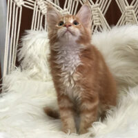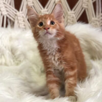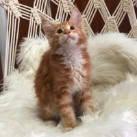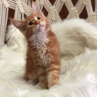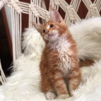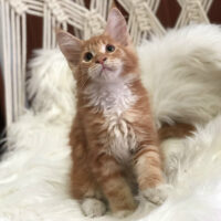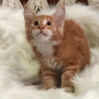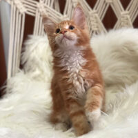Bé Maine Coon 2 tháng tuổi, màu Red Bicolor 🎨, lông dày bồng bềnh như mây ☁️, gương mặt đáng yêu với bộ ria trắng tinh 🤍.