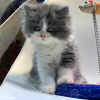 ✨ Briella – bé mèo Anh lông dài bicolor 2 tháng tuổi, khoác trên mình bộ lông trắng – xám mềm mượt như nhung 🩶🤍, vừa sang trọng vừa ấm áp. Đôi mắt tròn xoe long lanh như chứa cả bầu trời 🌌 cùng chiếc mũi hồng xinh xinh tạo nên thần thái “ngọt lịm tim” 🥰.