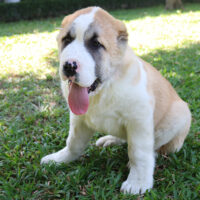 🌞 Cengiz là một bé Alabai đực 3 tháng tuổi, lông vàng kem – trắng sữa, mặt đeo “mặt nạ đen” rất oách, trông như một vệ thần tí hon đang chuẩn bị lớn nhanh thành “tướng quân gác cổng” cho gia đình bạn 💂♂️🐾
