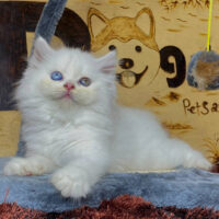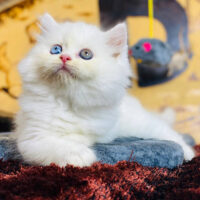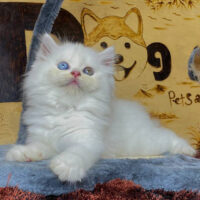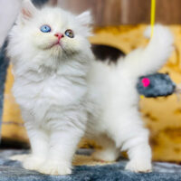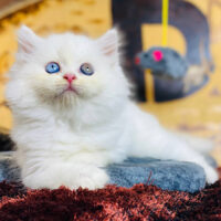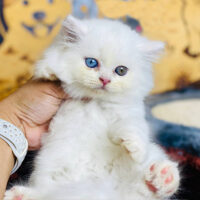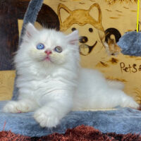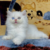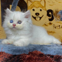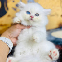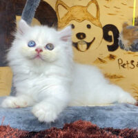 ✨ Cyra – mèo Anh lông dài trắng mắt 2 màu 2 tháng tuổi 🍼, nổi bật với bộ lông trắng muốt, mịn màng như bông tuyết ❄️.