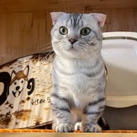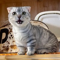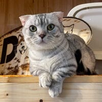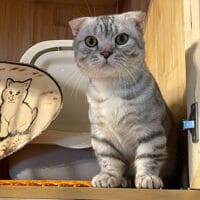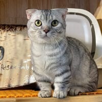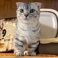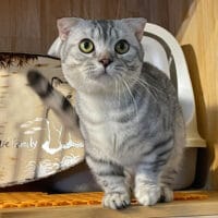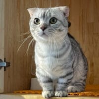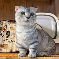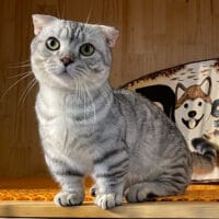 Mèo Munchkin Fold Silver Tabby chân ngắn tai cụp trưởng thành 1 năm tuổi, bộ lông vằn bạc lấp lánh, mắt xanh biếc/vàng óng, tính cách điềm đạm, tình cảm! 🤍 Chàng Xylos quý phái sẵn sàng về nhà mới! ✨