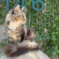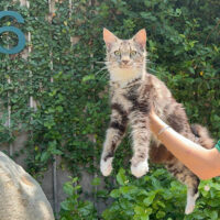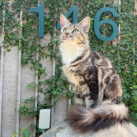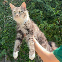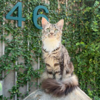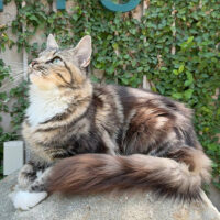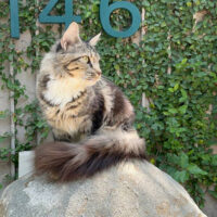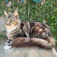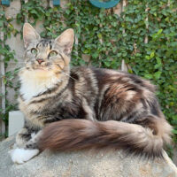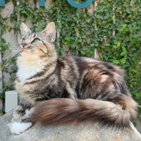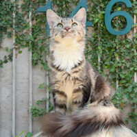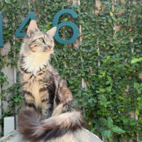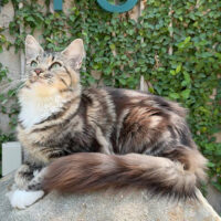 Zephyra 🌬️🐾👑 – nàng Maine Coon 6 tháng tuổi với bộ lông Tabby nâu huyền ảo 🌟🍂, ngực trắng tinh 🤍❄️, bốn “tất trắng” 🧦🤍 siêu xinh, đôi mắt xanh lục 💚👀 sáng như ngọc 💎. Đuôi dài bồng bềnh ☁️🌬️, thần thái sang chảnh 💃✨ khiến ai cũng phải ngoái nhìn 😻🙌.